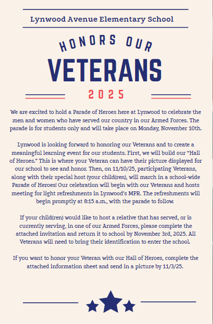 Lynwood is going to honor our Veterans with our annual Hall of Heroes and Veterans Day breakfast and parade. All the information is being sent home in backpacks today!