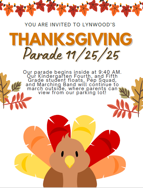 Lynwood has some fun events coming up that you are invited to in November. Our Thanksgiving Parade is on 11/25/25. This is an annual event parents have never participated in. Marching in our parade is our Kindergarten Fourth, and Fifth Grade students. But, every parent is invited to cheer us on. Students will march inside and outside of the building. The parent viewing area is our bus loop, so this event is weather dependent!